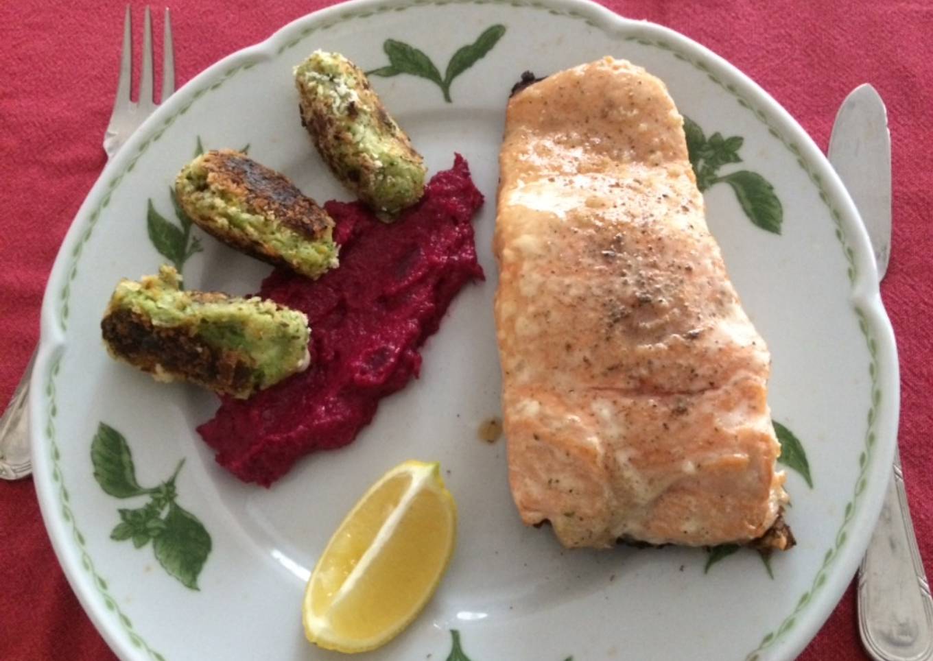 - Rebozar las croquetas. Si sin muy chiquitas (las hice mini), creo que no conviene pasarlas por yema de huevo. Disponer en asadera aceitada ligeramente o en sartén con tapa y cocinar inos 7’ girandolas con cuidado. Las serví sobre crema de remolachas, para acompañar salmón a la plancha.