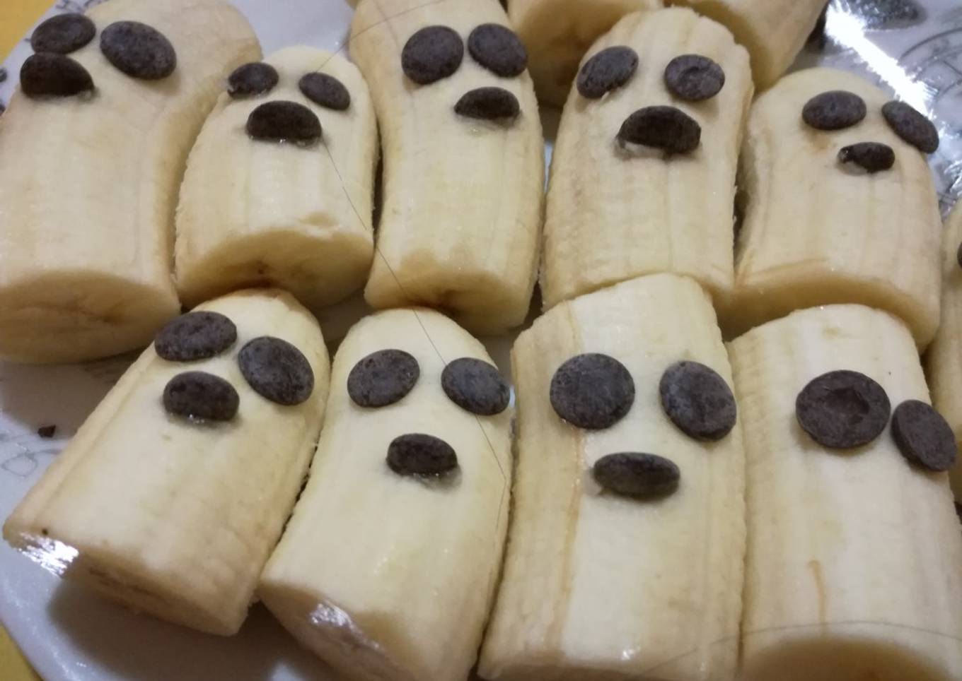 - Ponerle un par de pepitas de chocolate como si fueran los ojos y otra debajo, clavada en el plátano como si fuera la boca. ¡¡Buuuhhh!! Ya tenemos nuestro fantasma súper sano y delicioso!!