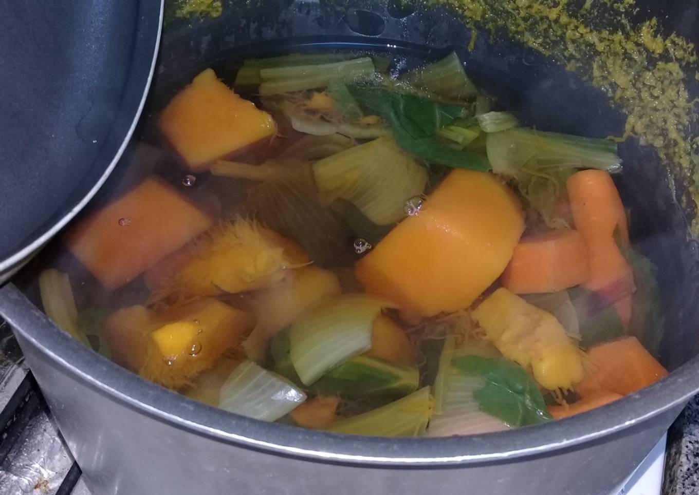 - Se lavan bien las verduras y se colocan en una olla a hervir durante 30 minutos. Luego de apagar el fuego y una vez que el caldo se ha entibiado, se separan las verduras de hoja verde de las otras. Se puede utilizar una espumadera o un colador.
