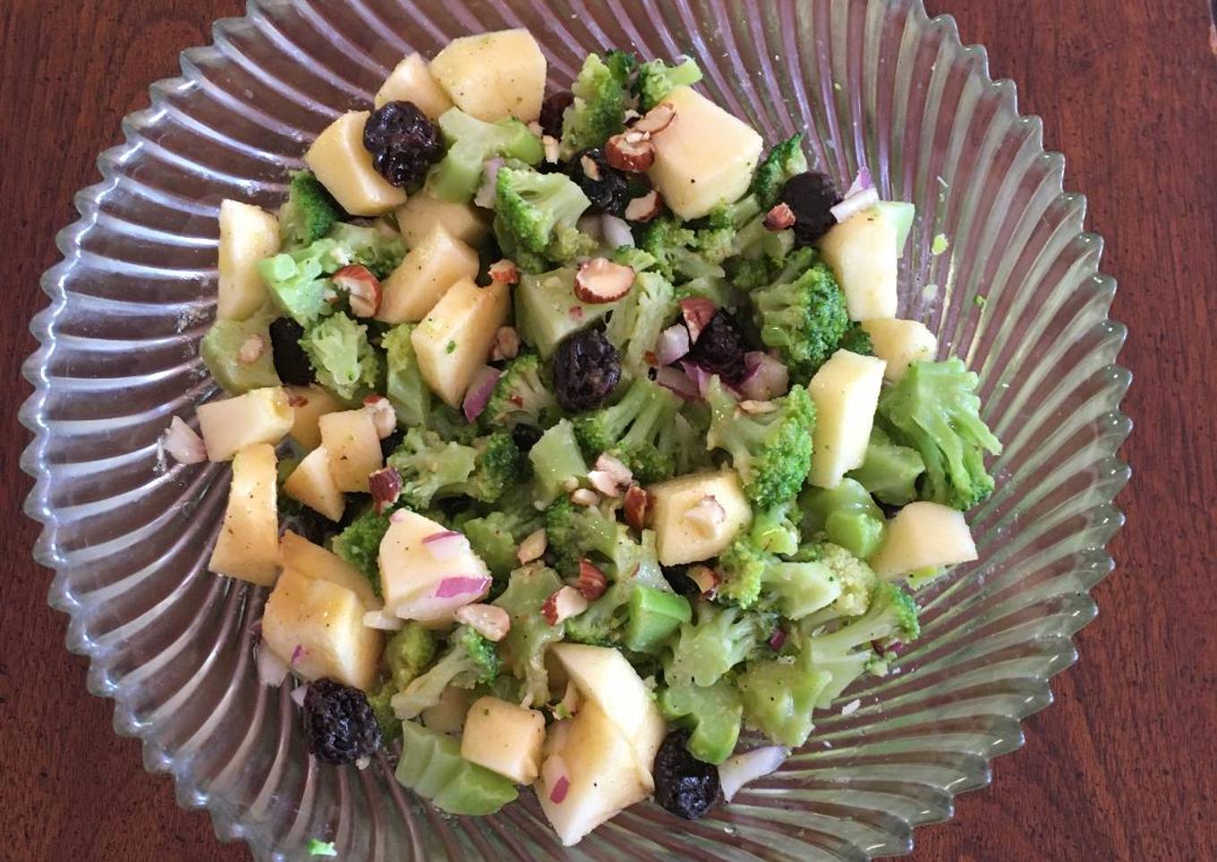 - Para esta ensalada diferente utilizamos brócoli congelado unos 8 o 10 ramitos y los ponemos a hervir 3 minutos, los escurrimos y los picamos. Agregamos 1 rebanada de cebolla roja picada, 1 manzana o perón golden pelado y cortado en cuadritos, un puño de pasitas y algo de nueces, piñones, pistaches, yo le puse 5 almendras picadas.