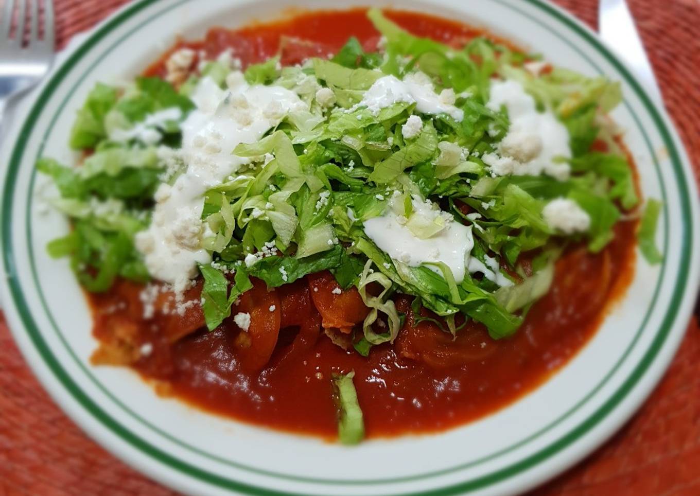- Cubrir con la salsa de tomate y agregar encima lechuga, crema y queso cotija.